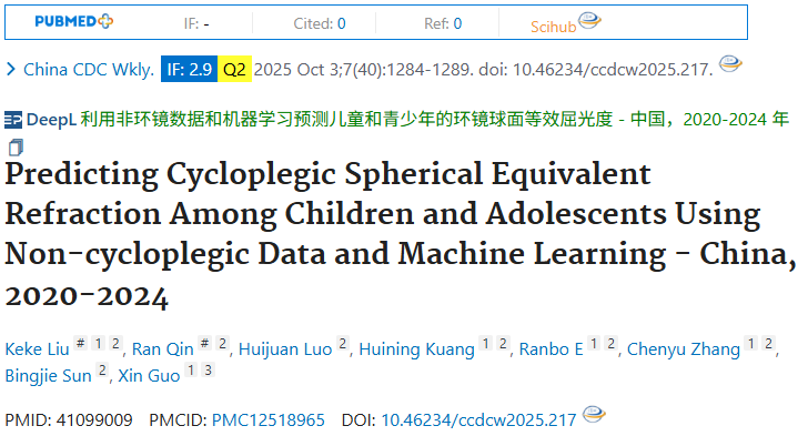 2025年10月3日,劉珂珂等人在《China CDC Wkly》上發(fā)表了一篇題為《Predicting Cycloplegic Spherical Equivalent Refraction Among Children and Adolescents Using Non-cycloplegic Data and Machine Learning—China, 2022-2024》的文章。本研究旨在開發(fā)和驗(yàn)證一種基于機(jī)器學(xué)習(xí)(ML)的模型,利用非睫狀肌麻痹屈光等效球鏡、眼軸長度、角膜曲率半徑、軸長/角膜曲率半徑比值和裸眼視力等參數(shù),預(yù)測5-18歲兒童的睫狀肌麻痹等效球鏡,為在無法實(shí)施睫狀肌麻痹的情況下進(jìn)行大規(guī)模屈光不正監(jiān)測提供實(shí)用工具。