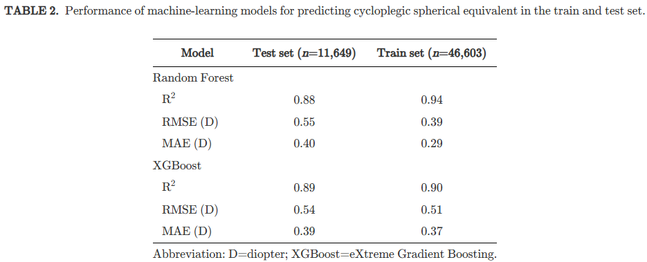 本研究成功構(gòu)建了基于隨機(jī)森林和XGBoost的ML模型,能夠利用非睫狀肌麻痹驗(yàn)光數(shù)據(jù)和眼部生物參數(shù)準(zhǔn)確預(yù)測兒童及青少年的睫狀肌麻痹等效球鏡。模型在測試集中表現(xiàn)出優(yōu)異的預(yù)測性能,明確了非睫狀肌麻痹等效球鏡、眼軸長度/角膜曲率半徑比值、眼軸長度和裸眼視力為關(guān)鍵預(yù)測因子。Bland-Altman分析證實(shí)了預(yù)測結(jié)果與真實(shí)值之間的良好一致性。該模型為在睫狀肌麻痹驗(yàn)光不可行的情況下,進(jìn)行大規(guī)模屈光不正監(jiān)測提供了準(zhǔn)確且實(shí)用的替代方案。