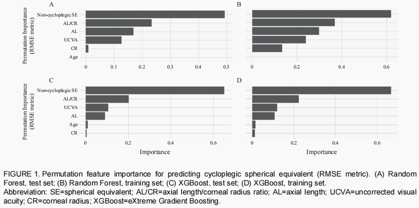 通過置換特征重要性分析,兩種機(jī)器學(xué)習(xí)模型均識(shí)別出一致的關(guān)鍵預(yù)測因子。如圖1所示,在測試集中,對(duì)隨機(jī)森林模型最重要的四個(gè)特征依次是非睫狀肌麻痹等效球鏡、眼軸長度/角膜曲率半徑比值、眼軸長度和裸眼視力;XGBoost模型的特征重要性排序與此完全一致。在訓(xùn)練集中,這一排序也保持穩(wěn)定。角膜曲率半徑和年齡這兩個(gè)變量雖然也被納入模型,但其相對(duì)重要性顯著低于前四個(gè)核心預(yù)測因子。這一結(jié)果凸顯了結(jié)合屈光度和生物測量參數(shù)進(jìn)行綜合預(yù)測的價(jià)值。