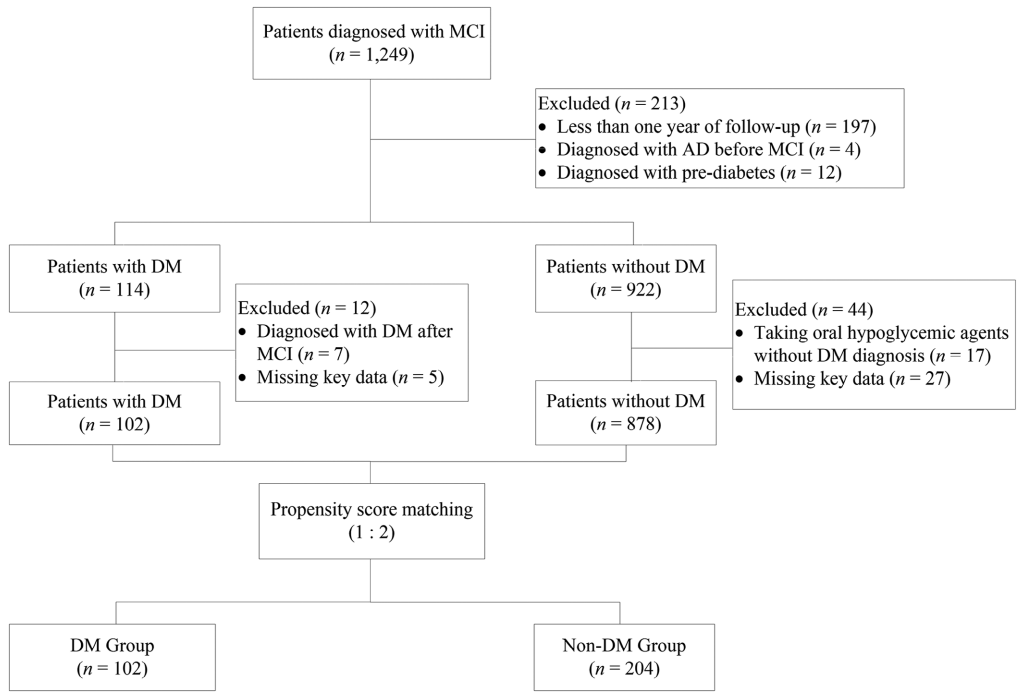 研究設計、設置和參與者:通過傾向評分匹配和逆概率處理加權分析980名MCI患者(分為DM和非DM組),評估MCI向AD的轉(zhuǎn)換率、神經(jīng)影像學變化和認知功能下降。