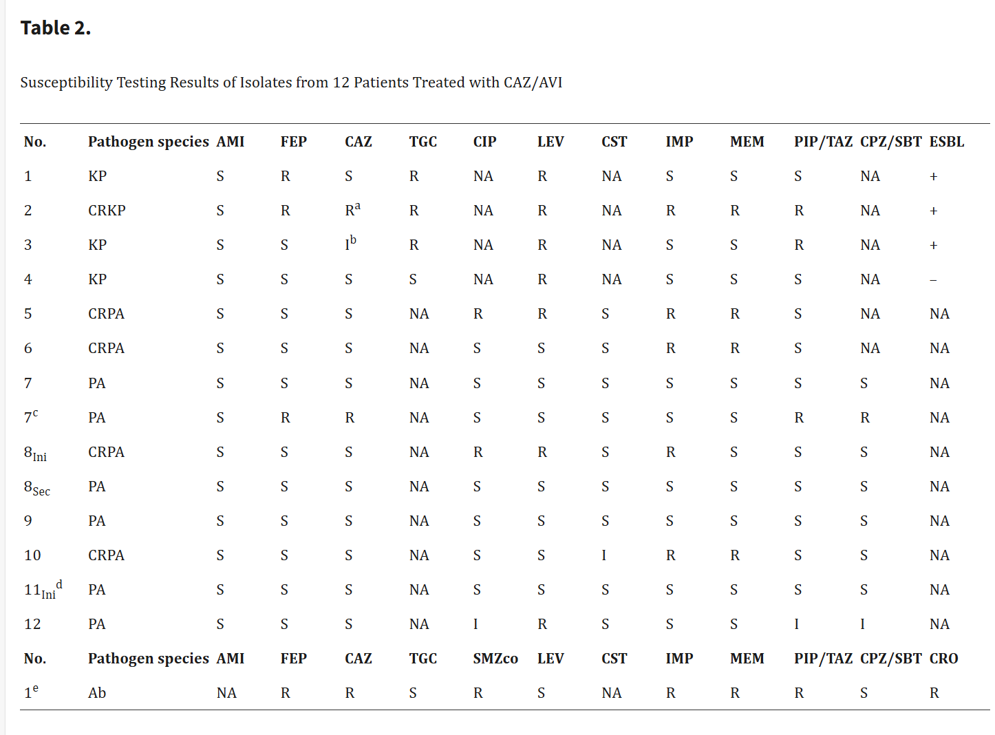 25例患者中有12例(48.0%)確診GNB感染。表2共列出了15種分離株。肺炎克雷伯菌(KP)感染共4個病程,耐碳青霉烯類肺炎克雷伯菌(CRKP)1例,碳青霉烯類敏感KP(CSKP)3例。PA感染發(fā)生在9個病程中,其中4個耐碳青霉烯類銅綠假單胞菌(CRPA)和6個碳青霉烯類敏感PA(CSPA)在5個病程中出現(xiàn)。在患者7中,在CAZ/AVI輸注的第五天觀察到頭孢他啶最低抑制濃度(MIC)升高(從2μg/mL增加到≥64μg/mL)的CSPA分離株。在患者8中,PA分離株在不同病程中從CRPA變?yōu)镃SPA?;颊?同時感染了碳青霉烯類耐藥鮑曼不動桿菌。根據(jù)由14個KP和PA組成的敏感性曲線(表2),5個(35.7%)對碳青霉烯類耐藥,3個(21.4%)對CAZ不敏感。