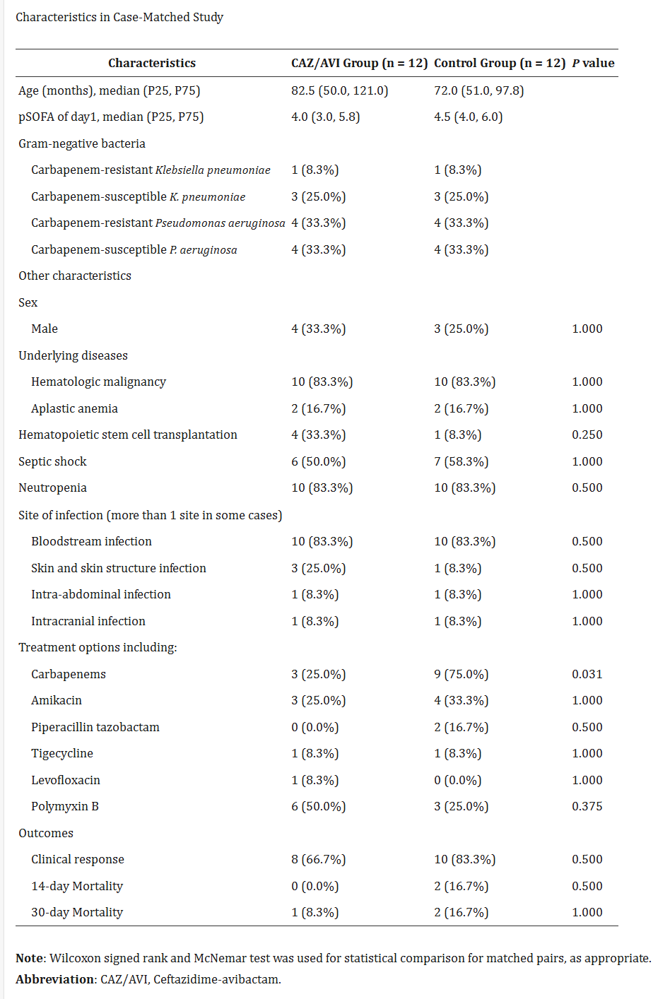 12個病例匹配對的特征和結(jié)果如表5和S3所示。對照組的大多數(shù)患者接受了含有碳青霉烯類藥物的抗生素。包括臨床反應、14天死亡率和30天死亡率在內(nèi)的結(jié)局沒有顯著差異。