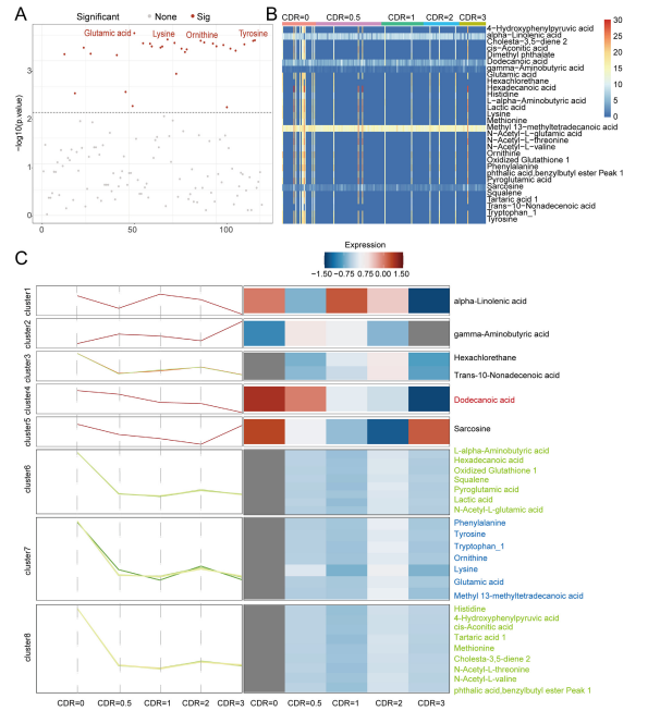 共納入199名參與者,并根據(jù)臨床癡呆評分(CDR)評分(0、0.5、1、2和3)進行分層。收集指甲碎片,并使用基于氣相色譜-質譜(GC-MS)的代謝組學方法進行分析。利用聚類、有序邏輯回歸和機器學習方法,識別不同認知組間差異表達的代謝物(DEM)。并進行通路富集和相關性分析,以探索潛在的疾病機制和臨床相關性。