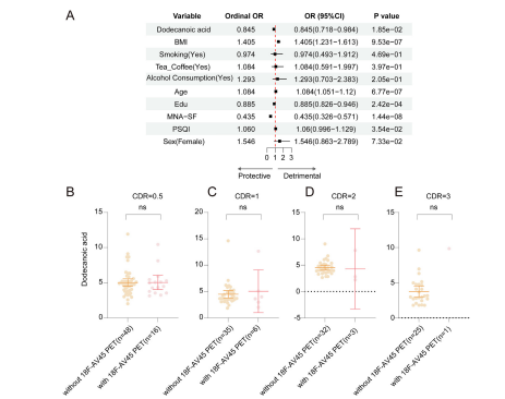 為了評估十二烷酸與疾病嚴重程度之間的獨立性關聯(lián),對十二烷酸采用了有序邏輯回歸模型。結果表明,在調整年齡、性別、教育、BMI、生活方式因素、營養(yǎng)和睡眠質量后,較低的十二烷酸與較高的CDR評分仍然顯著相關。為了確定觀察到的代謝物變化是否由淀粉樣蛋白病理學驅動,作者進一步根據(jù)淀粉樣蛋白PET結果進行了亞組分析。在每個CDR類別(0.5、1、2、3)中,比較了淀粉樣蛋白陽性個體和未掃描個體的指甲十二烷酸水平。發(fā)現(xiàn),在CDR=0.5、1、2和3的水平下,未觀察到顯著差異,這進一步證實了指甲代謝物反映的是疾病的嚴重程度,而不僅僅是淀粉樣蛋白的病理。