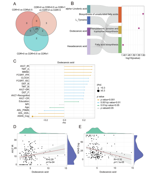 對指甲樣本進行非靶向GC-MS分析,鑒定出126種代謝物。其中,30種代謝物在五個CDR組(CDR=0、0.5、1、2和3)中存在差異表達,它們在認知能力下降的整個過程中呈現(xiàn)出顯著趨勢。在這些DEM中,十二烷酸從認知正常組(CDR=0)到晚期AD(CDR=3)呈現(xiàn)出尤為明顯的下降趨勢。對已鑒定的30種DEM進行聚類分析,得出8個不同的簇。如圖2C所示,包含十二烷酸的簇4在所有CDR組中均呈現(xiàn)出顯著的單調表達下降。