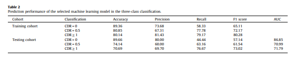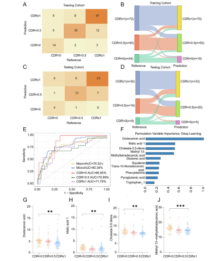 為了評估這些代謝物的診斷潛力,作者在29個DEM上訓練了多個機器學習模型,其中深度學習算法在多類分類中取得了最高的性能,在獨立測試集上實現(xiàn)了67.24%的總體準確率。識別CDR=0、CDR=0.5和CDR≥1的精度分別為80.0%、60.0%和69.7%(表2)。此外,該模型表現(xiàn)出很強的判別能力,microAUC為80.34%,macroAUC為76.52%。各組的單因素與靜息AUC值均超過70.0%,最高可達86.85%,支持了這些代謝生物標志物的穩(wěn)健性。變量重要性分析顯示,十二烷酸為最大貢獻者,其次是蘋果酸1、膽甾-3,5-二烯和甲基13-甲基十四烷酸。這些代謝物隨著CDR評分的增加呈現(xiàn)明顯的下降趨勢,進一步支持了它們作為AD診斷和監(jiān)測候選生物標志物的潛力。