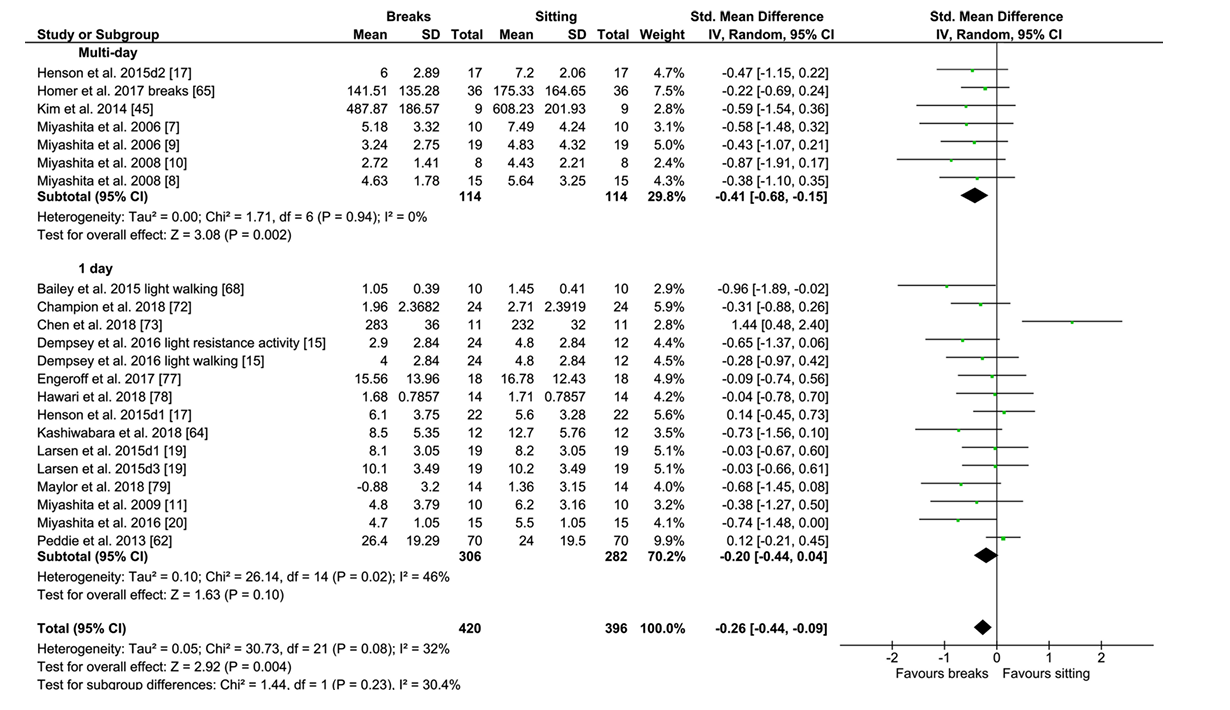 這表明久坐時加入PA間歇,可中度降低餐后血糖和胰島素水平,輕微降低甘油三酯,且所有差異均具有統(tǒng)計學意義。