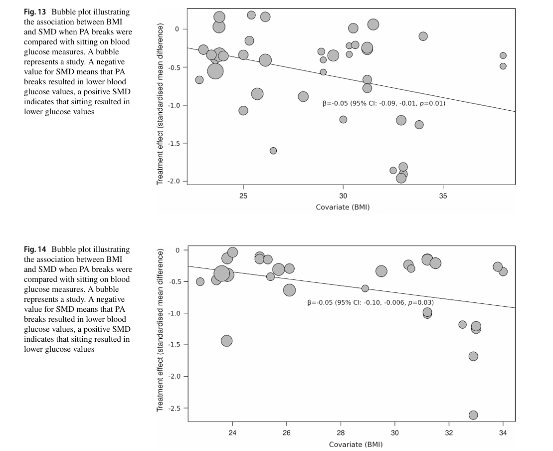 該結(jié)果提示BMI較高的人群,通過PA間歇打破久坐后,血糖和胰島素的改善效果更顯著,而甘油三酯的改善不受BMI影響。