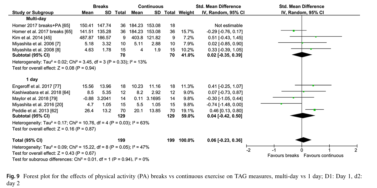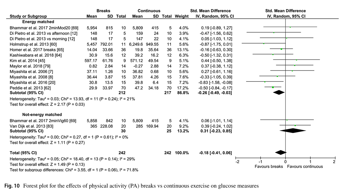 2020年2月,英國金斯頓大學RolandLoh和HannahJ.Moir團隊在《Sports Medicine》(中科院1區(qū),2023年影響因子11.7)發(fā)表了一項系統(tǒng)綜述與薈萃分析研究,結(jié)果顯示久坐時加入PA間歇可中度降低餐后血糖、胰島素水平,輕微降低甘油三酯,且BMI較高人群血糖改善更顯著;在能量消耗匹配情況下,PA間歇在降低血糖方面略優(yōu)于持續(xù)運動,但對胰島素和甘油三酯無顯著差異。