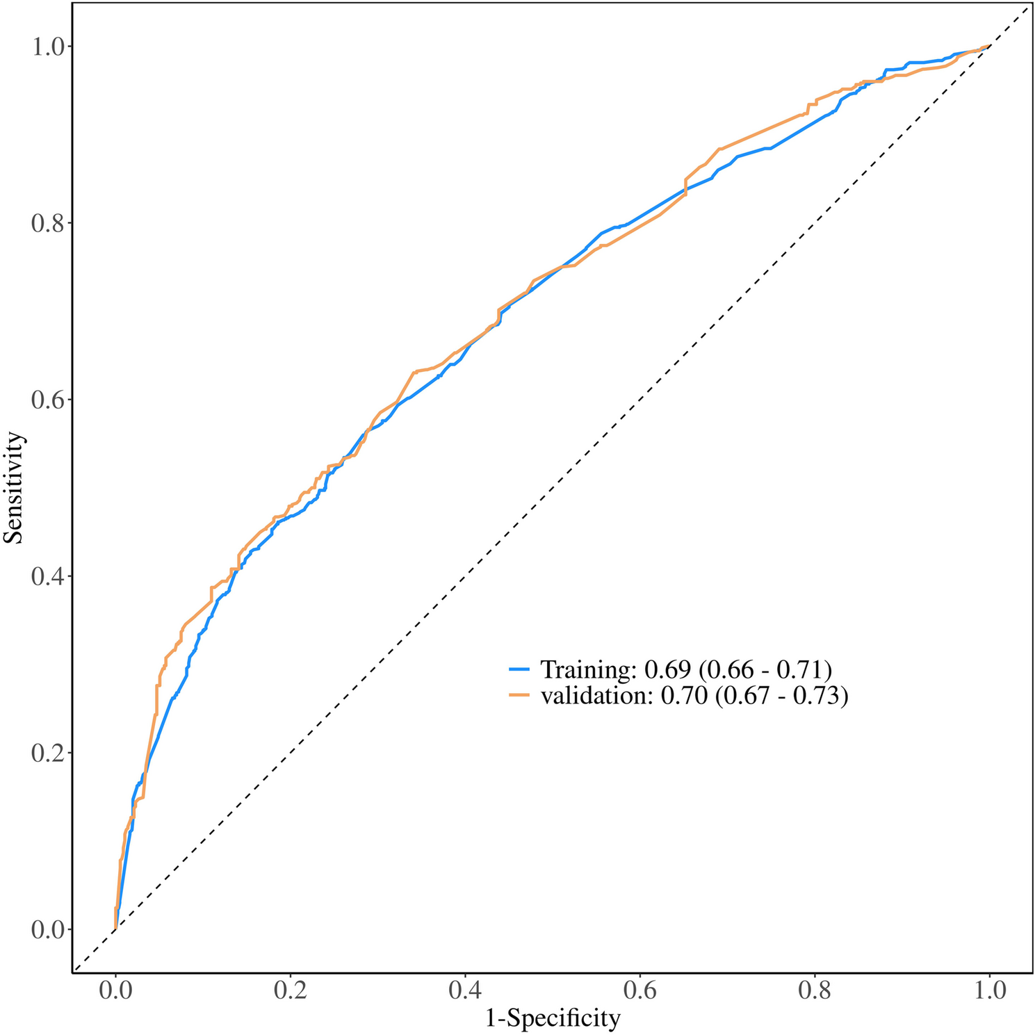 基于上述五個關(guān)鍵變量的多變量邏輯回歸模型顯示,在訓(xùn)練集中,模型的AUC為0.69(95% CI: 0.66-0.71),在驗證集中,AUC為0.70(95% CI: 0.67-0.73)。訓(xùn)練集和驗證集的校準(zhǔn)曲線(Hosmer-Lemeshow檢驗P值分別為0.735和0.099)均顯示預(yù)測概率與實際概率高度一致。決策曲線分析(DCA)也表明該列線圖模型具有良好的臨床凈收益。這些結(jié)果證實,該預(yù)測模型具有可接受的預(yù)測性能和良好的準(zhǔn)確性,可用于臨床。(圖 2, 圖 3, 圖 4, 圖 5)
