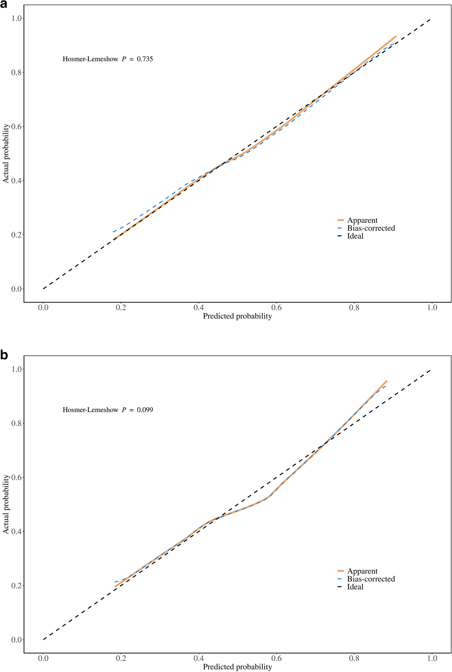 圖4 用于預(yù)測訓(xùn)練集和驗證集中最佳囊胚發(fā)育的列線圖的校準(zhǔn)曲線。a.訓(xùn)練集中的校準(zhǔn)曲線。b.驗證集中的校準(zhǔn)曲線